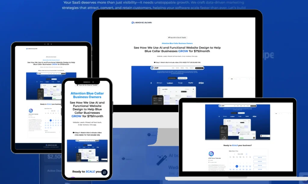 Fully optimized for performance and conversions, the page delivers a smooth experience across desktop, tablet, and mobile devices, helping Launch Scale Win attract leads and scale their customer base.